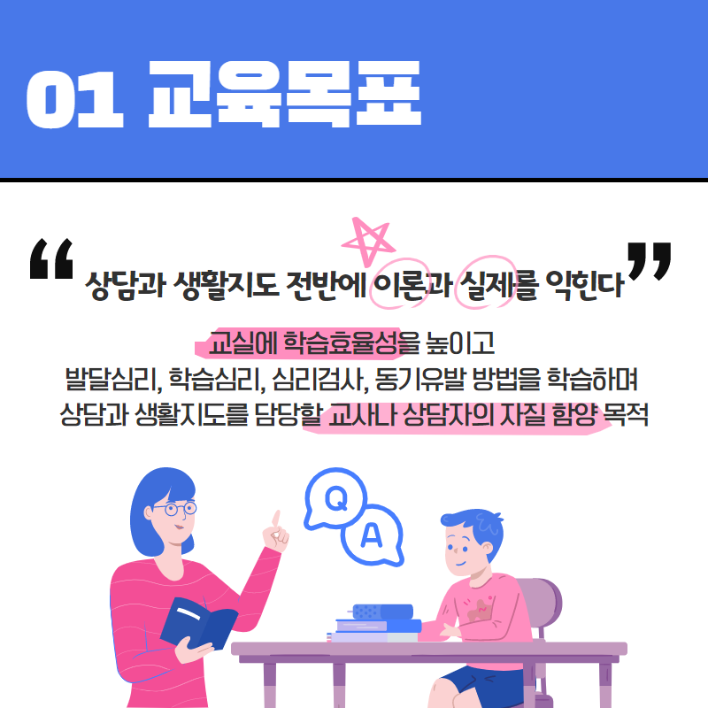 교실학습의 효율성을 높이고 학습자의 지적, 정의적, 심동적 행동특성을 이해하기 위하여 발달심리, 학습심리, 심리검사, 동기유발 방법을 학습하며 상담과 생활지도를 담당할 교사나 상담자의 자질을 함양할 목적으로 상담과 생활지도 전반에 이론과 실제를 익힌다.