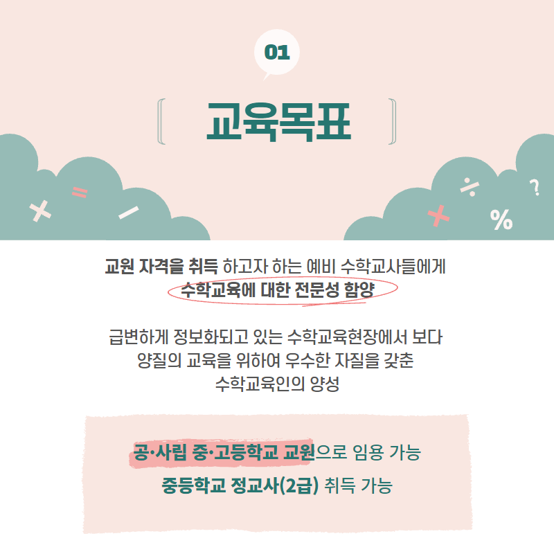 수학교육전공은 교원 자격을 취득하고자 하는 예비 수학교사의 양성과 현직 중등학교 수학교사의 재교육을 위한 교육과정을 운영하고 있습니다. 수학교사와 예비 수학교사에 대한 교육의 목표는 수학교육에 대한 전문성을 함양하고, 교육현장을 개선할 수 있는 자질과 문제 해결 능력을 배양하며 변화하는 미래 사회에 대처할 수 있는 인재 양성에 중추적 역할을 담당할 수 있도록 하는 것입니다. 이를 위해 수학교과 교수학습의 전문성을 확보하여 교과 내용별로 능률적인 교수학습 방법과 수업을 적극적으로 개선하는 등 교육현장의 문제 해결 능력을 키우는 등의 교육을 합니다.