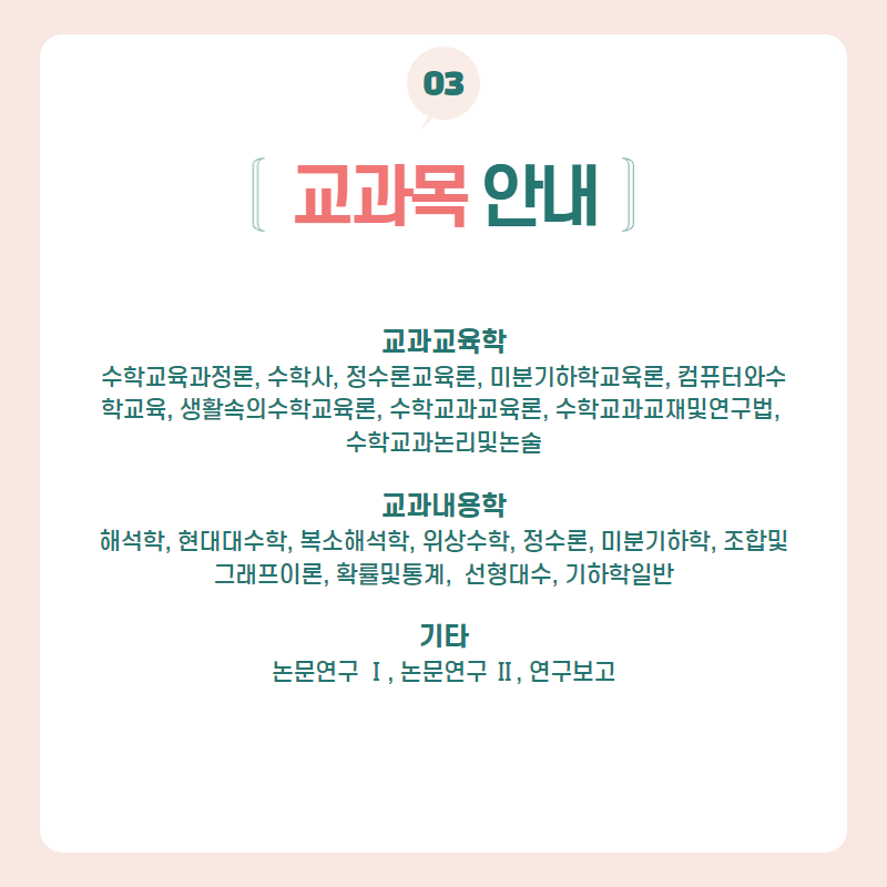 수학교육개량에 관한 근대적 운동, 수학교육의 현대화 및 한국수학교육의 변천, 수학교육의 학습 및 지도법의 내용을 현장교육과 관련시켜 교육한다. - 322218 수학교과교재및연구법(Teaching Material and Methods for Mathematics)