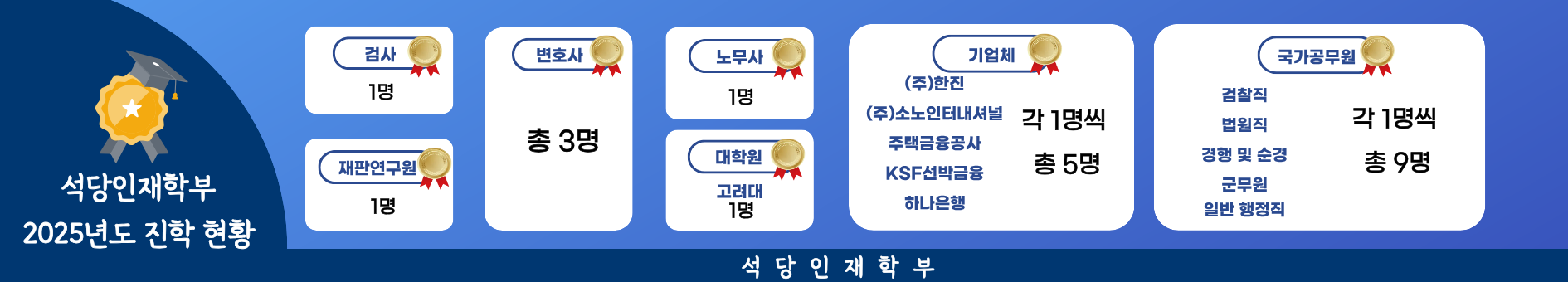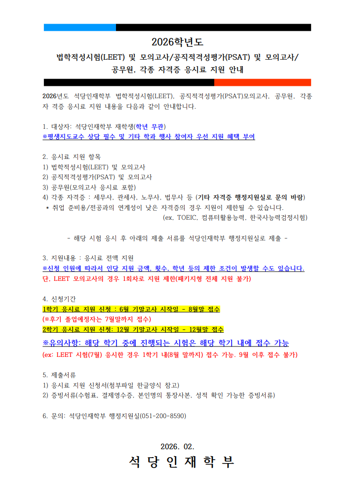 2026년 검사 임용 합격자(이다교) 석당인재학부 졸업생 "3년 연속" 검사 합격"2026년 검사 최종 합격" 이 * 교 동아대 법과대학 동문회, 제3회 유곡 박원영 교수 장학금 전달식 석당인재학부 공공정책학전공"석당인재학부 출신 2명, 법학전문대학원 장학금 수여" 2025-2학기 제 2회 석당인재 모의재판 석당인재학부 공공정책학전공"고급인재육성의 산실" 석당인재학부 2024-2학기 모의토론(2024.11.18) 석당인재학부 공공정책학전공"고급인재육성의 산실" 석당인재학부 2024학년도 2차 콜로키움(고대 신창섭 교수님) 석당인재학부 공공정책학전공"고급인재육성의 산실" 석당인재학부 2024-1학기 모의재판 석당인재학부 공공정책학전공"고급인재육성의 산실" 석당인재학부 메인비주얼1 석당인재학부 공공정책학전공"고급인재육성의 산실" 석당인재학부 메인비주얼 석당인재학부 공공정책학전공"고급인재육성의 산실" 석당인재학부 5 석당인재학부 공공정책학전공"고급인재육성의 산실" 석당인재학부 메인비주얼2 석당인재학부 공공정책학전공"고급인재육성의 산실" 석당인재학부 이전 장면 1 다음 장면 정지 재생 새로운 소식 공지사항 더 보기 학부행사 더 보기 석당소식 더 보기 이전 장면 다음 장면 정지 재생 교수소개 석당인재학부 입학안내 석당인재학부 장학안내 학부소개 포토갤러리 더 보기 학과소개 College of Seokdang Honors 25만 동문들의 염원을 실천하면서 명문사학의 전통을 잇고 21세기를 선도하는 학부로서 동아대학교 대표 학부로서 자리매김합니다. 학과 SNS 인스타그램 유튜브 이미지 배너2 준비중입니다. 전공연계도 교과과정 학사일정 진학 및 취업 이전 장면 다음 장면